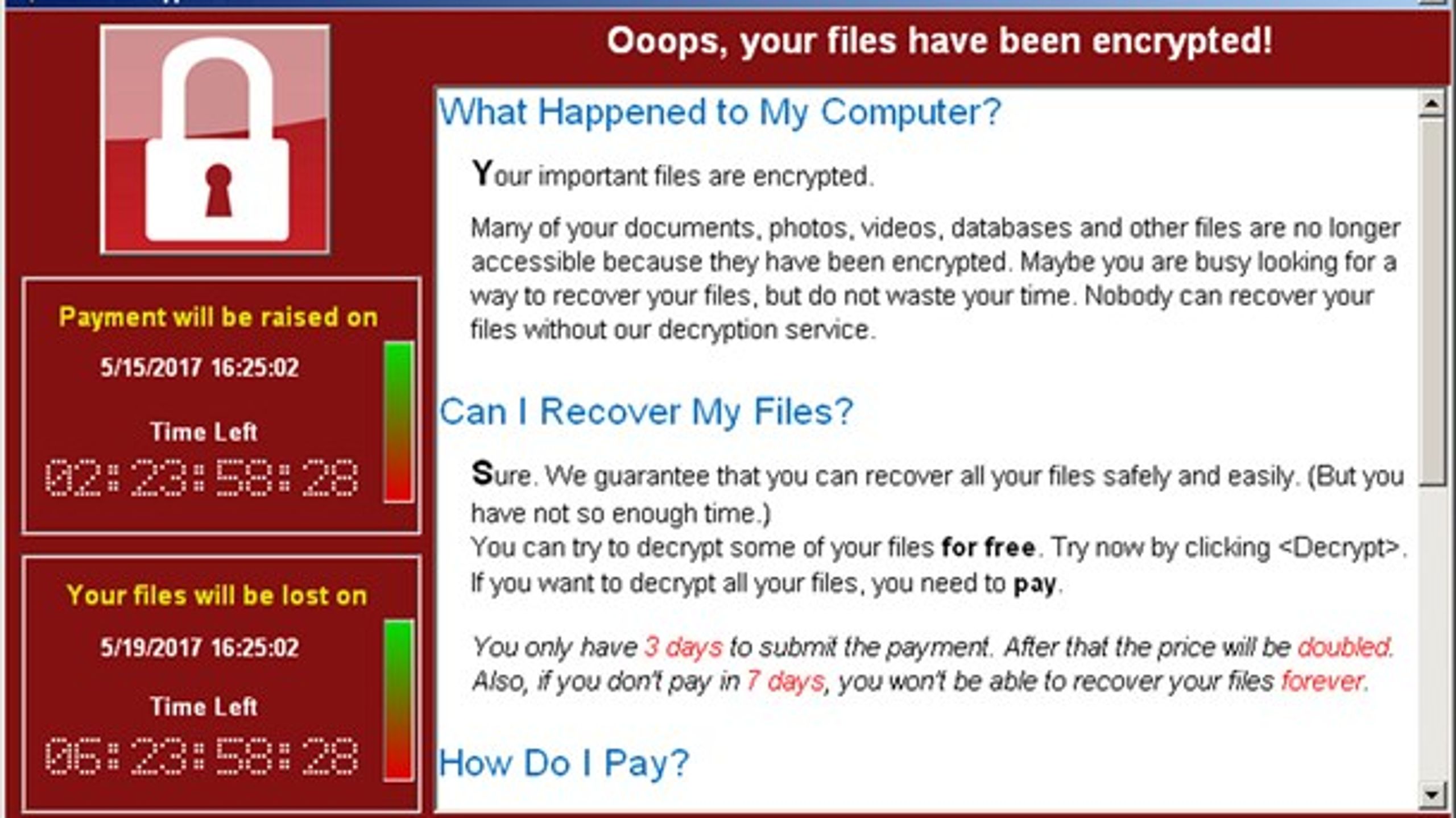 12. maj 2017 begyndte en virus at sprede sig gennem internettet. Virussen låste de angrebne computeres data og forlangte løsepenge for at låse dem op igen. I løbet af få dage havde den inficeret mere end 200.000 maskiner i 150 lande. Hårdest gik det ud over Storbritanniens National Healthcare Service, de offentlige hospitaler, hvor 70.000 maskiner, deriblandt MRI-scannere og køleudstyr til blod, blev sat ud af spillet.