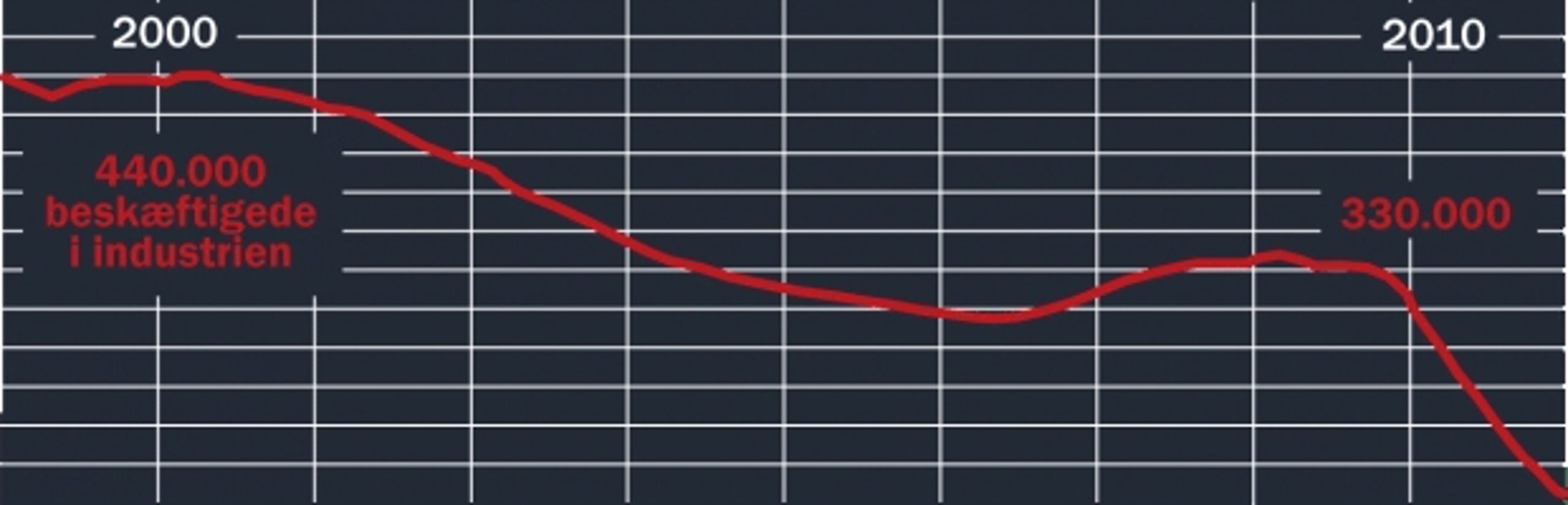 Danmark er under afvikling som industri- og produktionsland. I løbet af de sidste ti år er udviklingen accelereret, og ikke mindre end 25 pct. af alle job i industrien, eller rundt regnet 110.000 arbejdspladser, er forsvundet. Se figur 1.