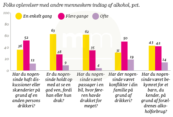 Vi føler os heller ikke presset til at drikke. Selv om vi har en oplevelse af, at det kan være svært at sige nej tak til alkohol, så har de færreste danskere drukket alkohol, fordi det blev forventet af dem. Kun godt hver 10. dansker har ’flere gange’ eller ’ofte’ drukket alkohol med sine venner til f.eks. en middag, fordi det var forventet, og ikke fordi de havde lyst. Lidt færre – 8 pct. – har gjort det samme i selskab med sin familie.