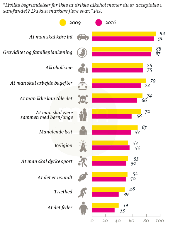 Det er også tankevækkende, at stort set alle de 12 argumenter for at sige nej tak til alkohol, som indgår i den nye undersøgelse, er mindre accepteret i dag end for 8 år siden. Kun religion bliver i dag opfattet af flere danskere som et acceptabelt argument for at afslå at indtage alkohol.