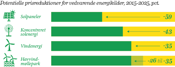 Prisen på elektricitet fra vedvarende energikilder forventes at blive markant lavere frem mod 2025 på globalt plan på grund af teknologisk udvikling, opskalering af projektstørrelser, mere forudsigelig politisk regulering og øget konkurrence. For offshore-vind kan prisen falde yderligere op til 35 pct. ved udnyttelsen af næste generations vindturbiner.
