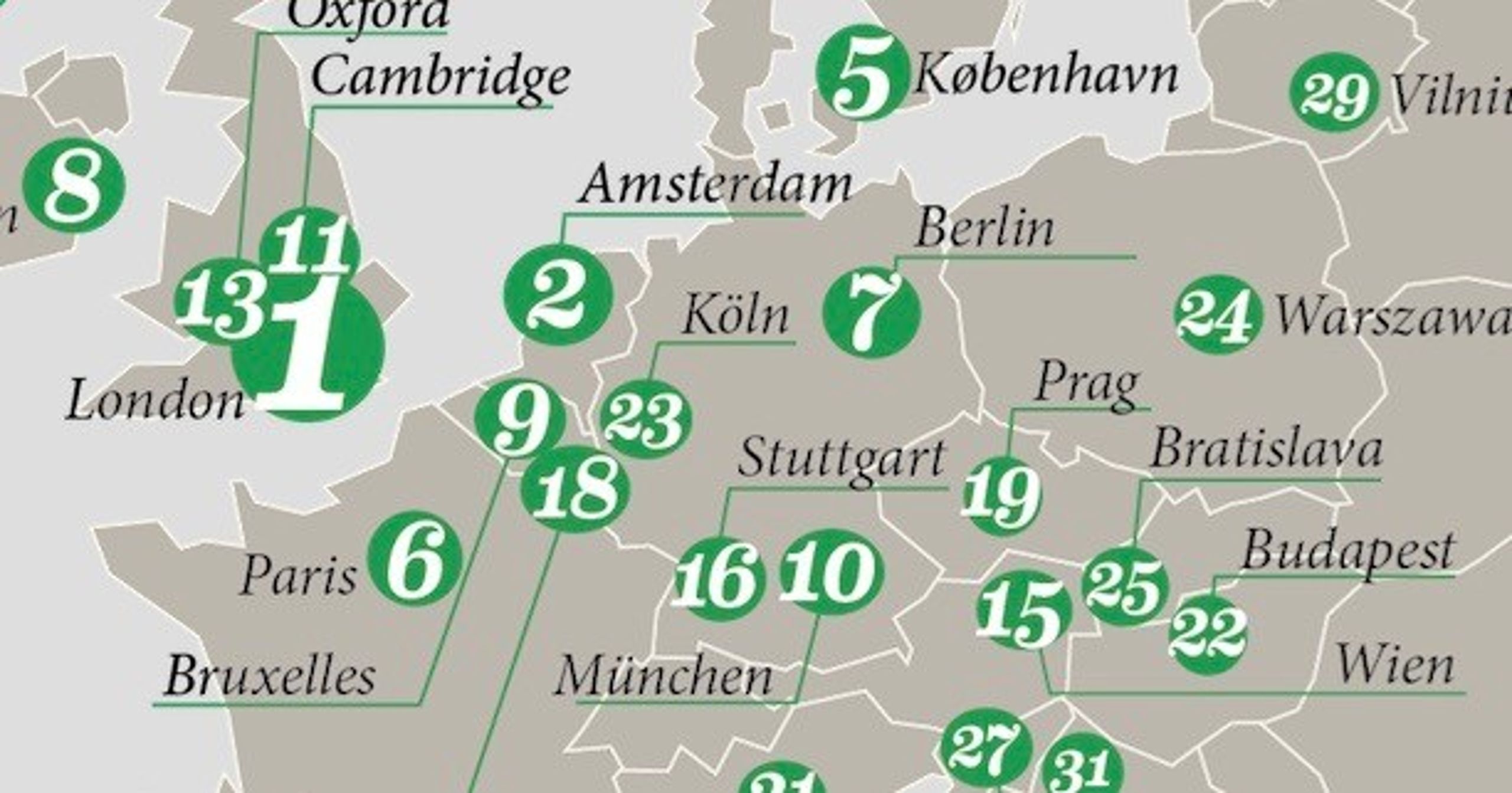 Det overordnede tema ”adgang til kapital” indeholder eksempelvis de tre undertemaer: ”muligheder for early-stage-finansiering”, ”muligheder for late-stage-finansiering” og ”muligheder for crowdfunding”. På det område kan London samlet set tilbyde de bedste forhold, efterfulgt af Paris, Amsterdam og København på fjerdepladsen, mens storbyer som München (8), Madrid (13) og Rom (25) halter efter.