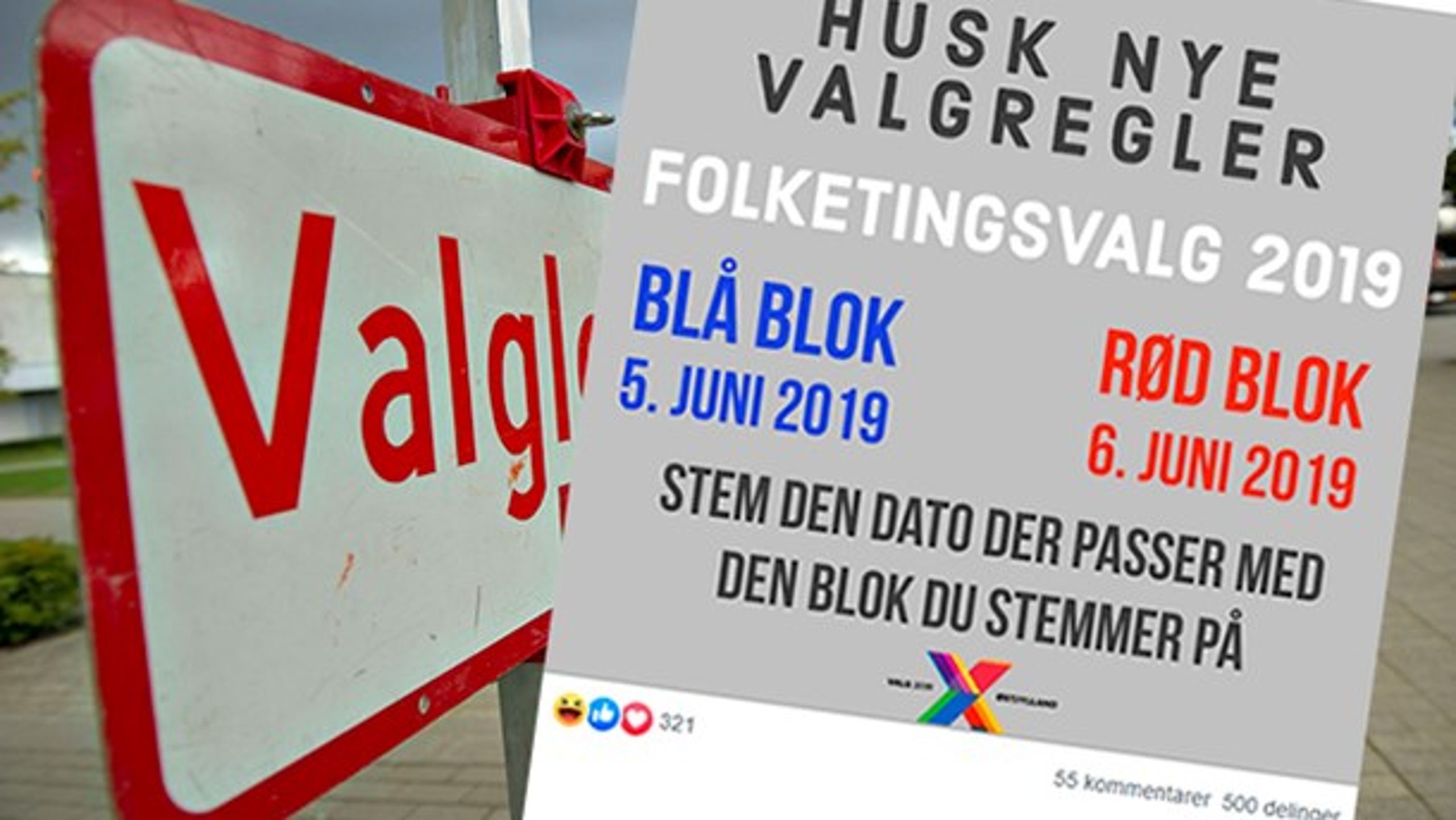”Husk de nye valgregler. Folketingsvalg 2019. Blå blok 5. juni 2019. Rød blok 6. juni 2019. Stem på den dato, der passer med den blok, du stemmer på.”