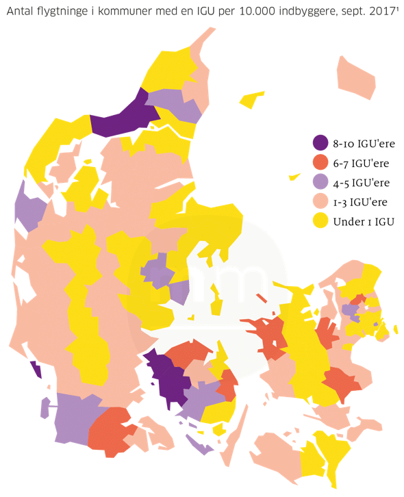 Note1: Flygtningene fordeles med udgangspunkt i, hvor mange udlændinge der i forvejen bor i kommunen. Det betyder, at flere kommuner, f.eks. på den københavnske vestegn, slet ikke modtager flygtninge, mens andre kommuner kun modtager ganske få.