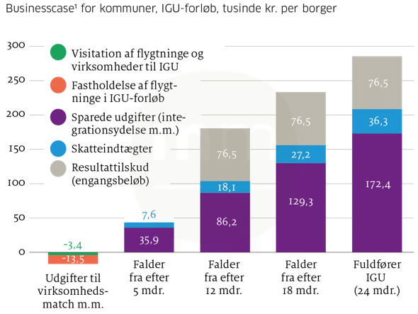 Note1: Udlændinge- og Integrationsministeriet har udarbejdet businesscases for arbejdet med integration for samtlige kommuner. I kroner og øre er der meget små forskelle på de økonomiske gevinster fra kommune til kommune. For Assens, Frederiksberg, Jammerbugt og Middelfart er den samlede gevinst pr. borger efter 2 år på IGU i alle fire kommuner mere end 260.000 kr.