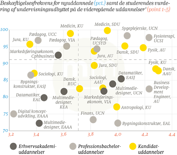 I dette ”dårlige” hjørne ligger bl.a. en række erhvervsakademiuddannelser til f.eks. multimediedesigner, datamatiker og markedsføringsøkonom, der altså scorer relativt lavt for både beskæftigelse og undervisningsudbytte.