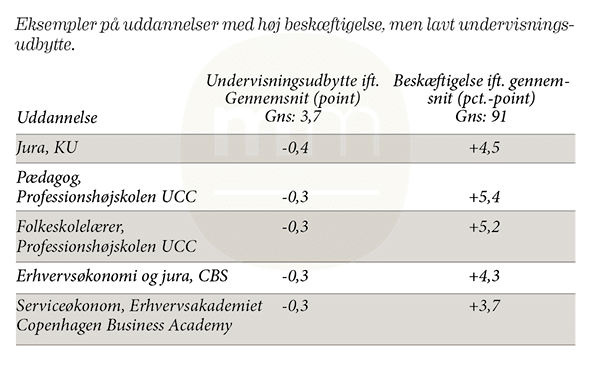 Ved at sammenholde beskæftigelsen for nyuddannede med de studerendes vurdering af undervisningsudbyttet på forskellige videregående uddannelser, bliver det tydeligt, at de to ting ikke entydigt hænger sammen. Nogle uddannelser har til trods for en høj beskæftigelse en relativ lav vurdering af undervisningsudbyttet.