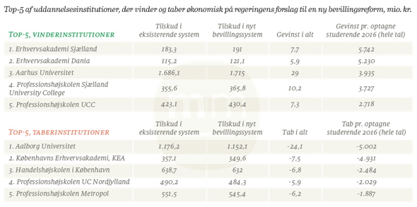 Det nordjyske universitet står ifølge regeringens tekniske beregninger til at miste 24 millioner kr. årligt som følge af reformforslaget, hvilket er et betydeligt større tab end nogen anden uddannelsesinstitution, selv om også Københavns Erhvervsakademi har udsigt til at tabe 7,5 mio. kr., CBS vil miste 6,8 mio. kr., og Professionshøjskolen Metropol kan se frem til at miste 6,3 mio. kr. Omvendt står bl.a. Erhvervsakademi Sjælland og Aarhus Universitet til milliongevinster. Se figur 1.