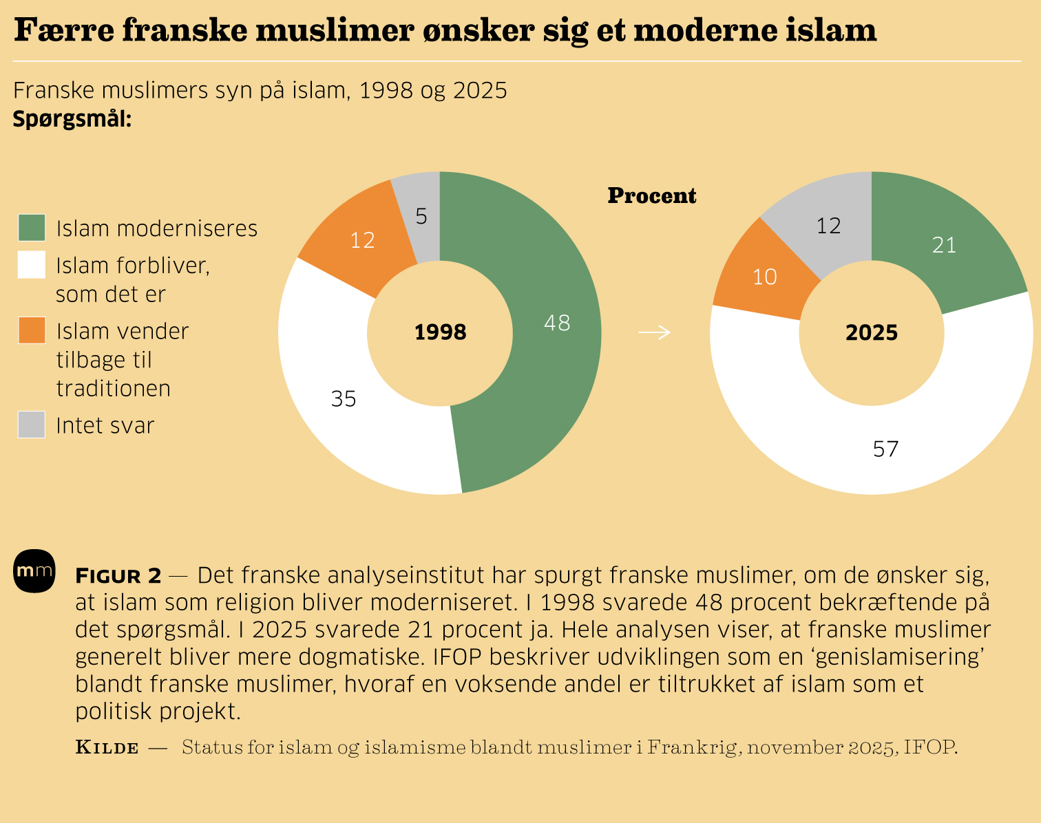 Ud over radikaliseringen på højre- og venstrefløjen oplever Frankrig i øjeblikket også en betydelig radikalisering blandt den kraftigt voksende andel af muslimer i landet. Således er der sket et stort fald i antallet af muslimer, som mener, at islam som religion bør moderniseres. Se figur 1.
