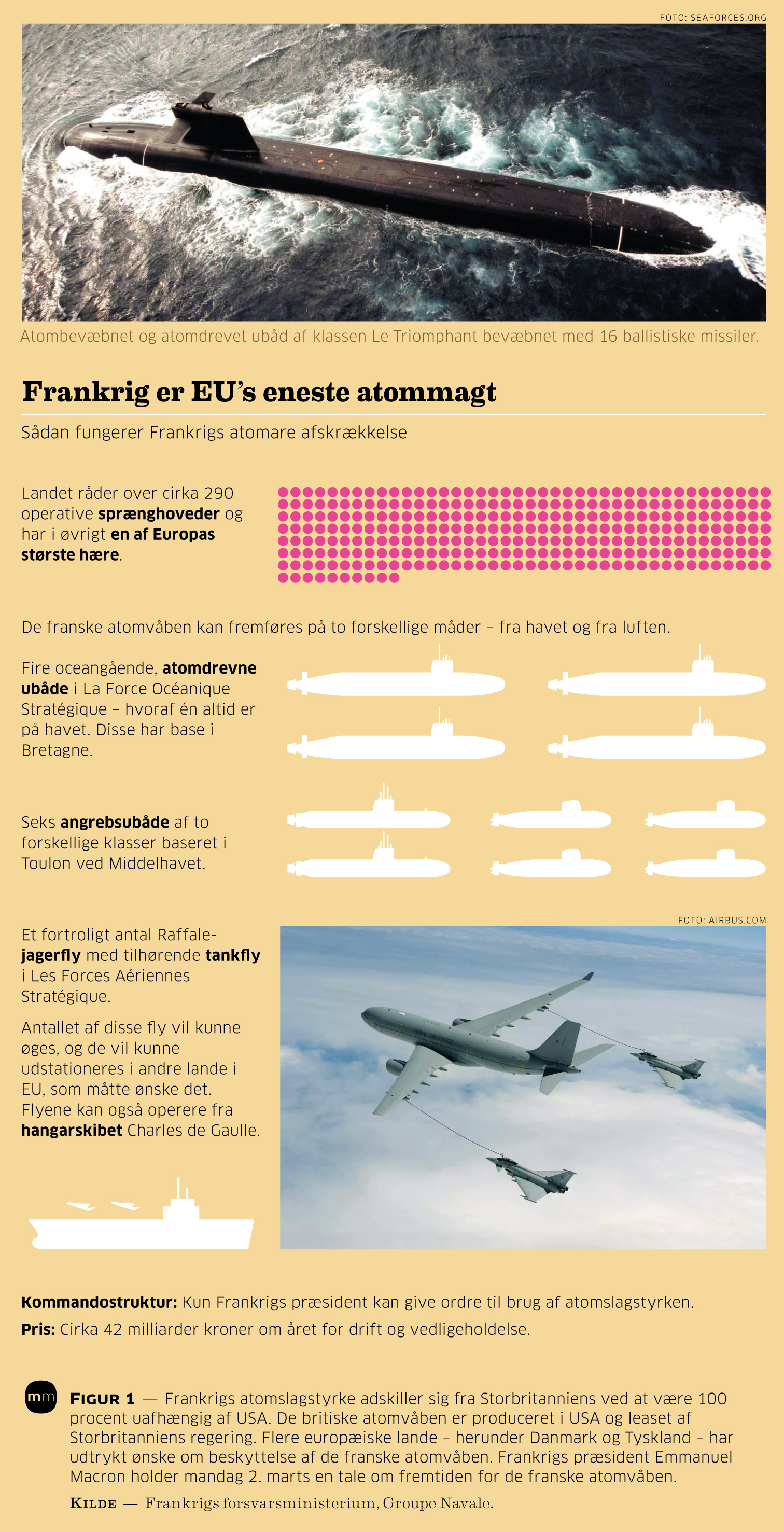 Det er den styrkeposition, Frankrigs nuværende præsident, Emmanuel Macron, på mandag taler fra, når han på halvøen île Longue i Bretagne taler til Frankrig og Europa. Dette er basen, hvor Frankrigs atombevæbnede og atomdrevne oceangående ubåde holder til.