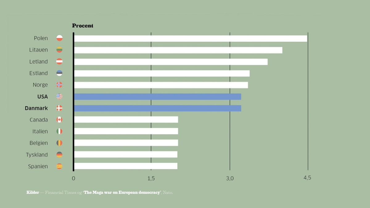 Danmark bruger nu en lige så stor andel af BNP på Forsvaret som den militære sværvægter USA. Det skriver Financial Times på baggrund af tal fra Nato.