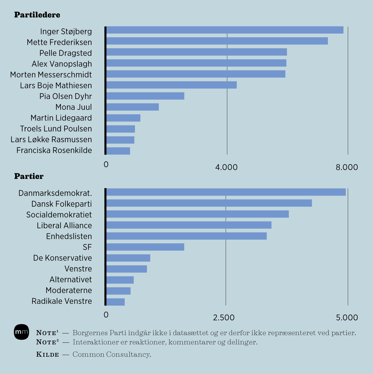 Det er fløjpartier samt Socialdemokratiet med Mette Frederiksen, der henter flest interaktioner på Facebook. De to regeringspartier Venstre og Moderaterne halter omvendt gevaldigt efter i engagement. Der er samtidig en tæt sammenhæng mellem partiledernes og selve partiets præstationer på Facebook.